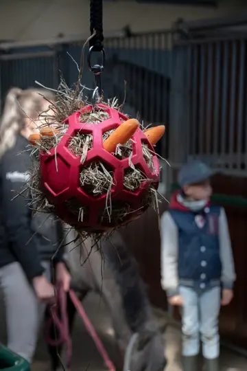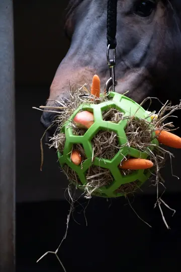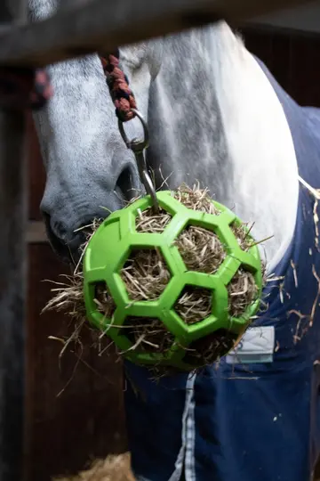 Vul deze slow feeder bal met hooi en stop er eventueel nog iets extra lekkers bij (zoals groente of kruiden), om je paard zo urenlang bezig te houden. De flexibele bal bestaat volledig uit natuurrubber en is makkelijk te vullen en te reinigen.