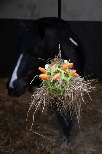 Hang de Hay Slowfeeder snel en eenvoudig op aan het meegeleverde soft halstertouw.
