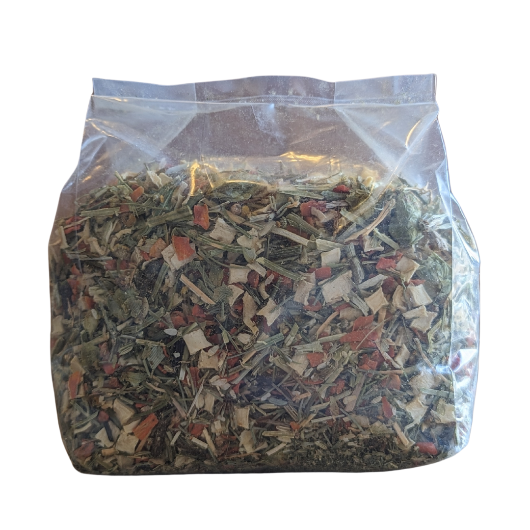 Voor honden is de kruidenmix een goede aanvulling op het vleesmenu, groenten en kruiden bevatten veel vezels, welke nodig zijn voor een goede darmwerking voor de hond.