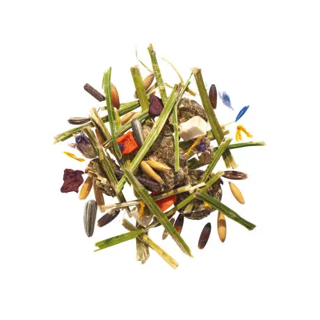Het bevat Myo Protein Flakes en Beierse luzerne, om eiwitten te leveren die rijk zijn aan ruwe celstof; smakelijke gele en zwarte haver,